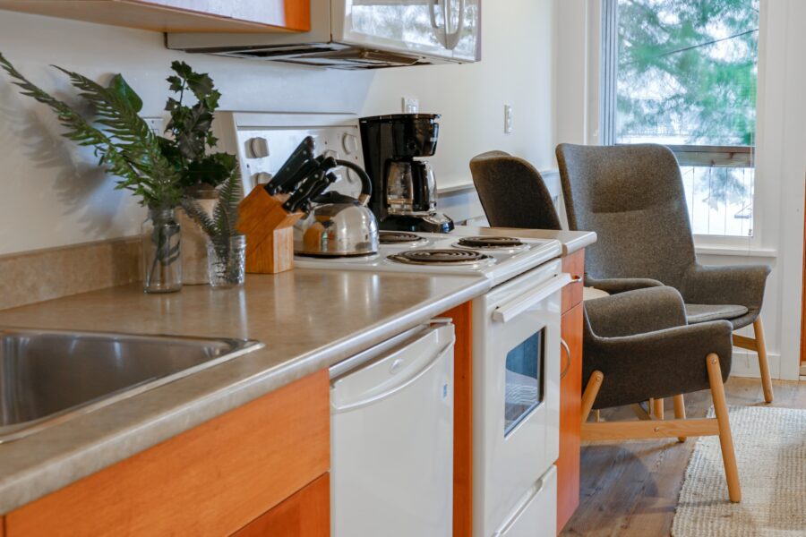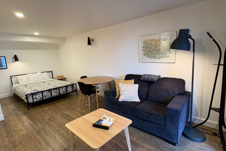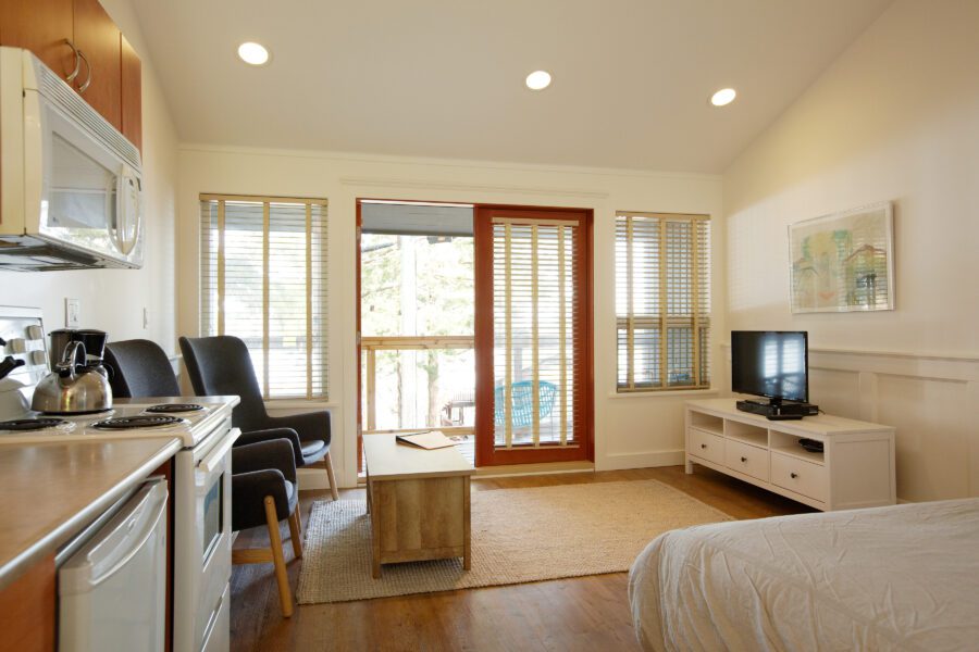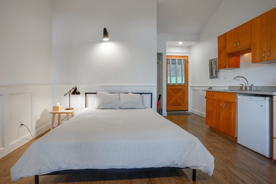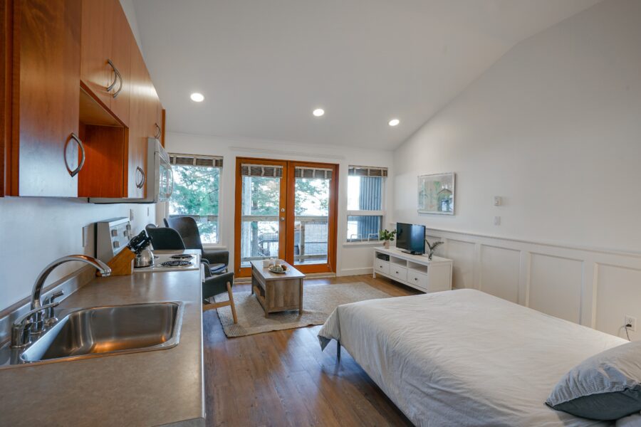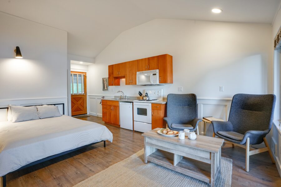 Our bright and airy studio suites feature a kitchenette, queen bed and French doors that open onto a waterfront view. This is the perfect suite to use as your base for outdoor adventures.