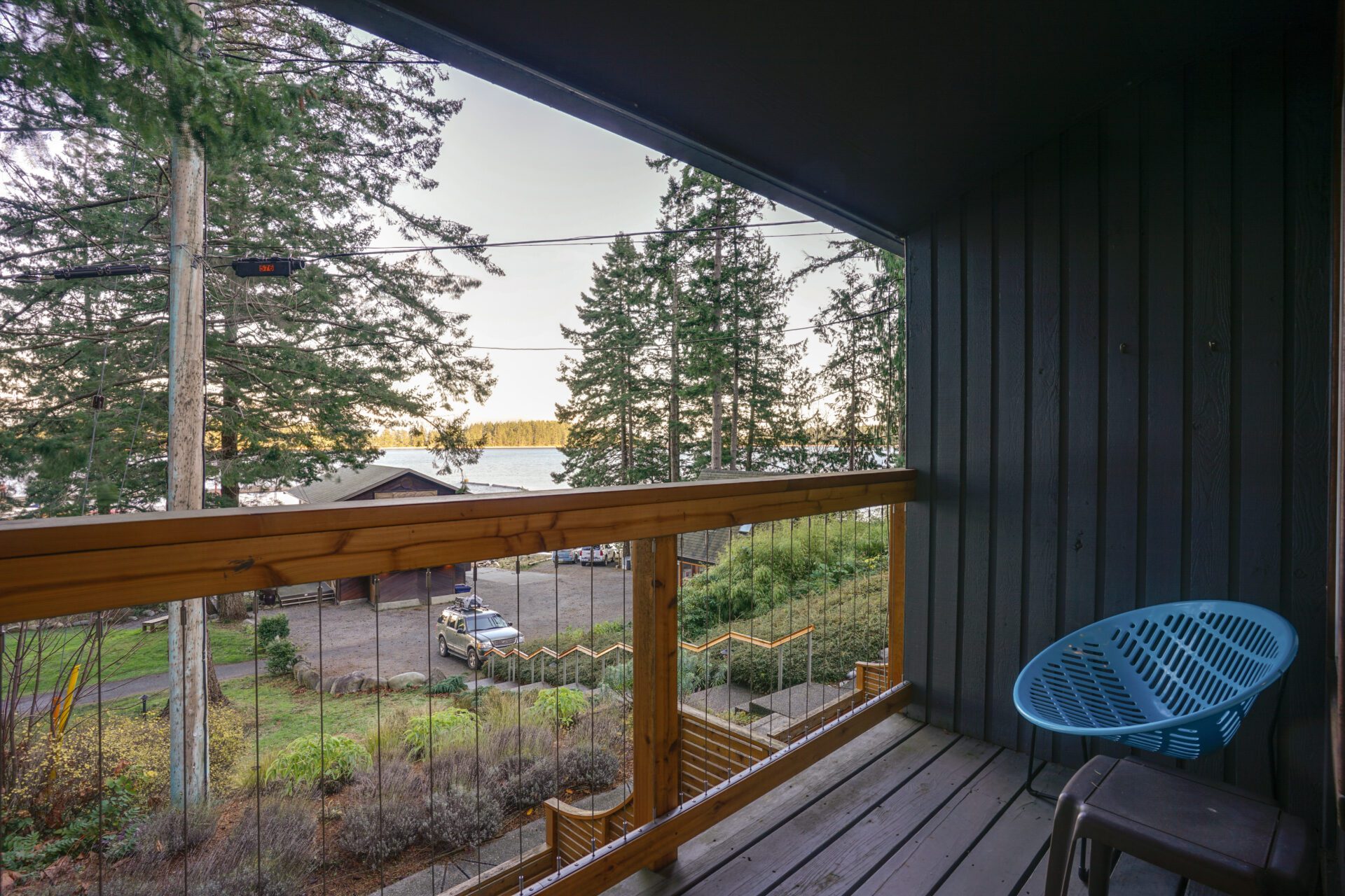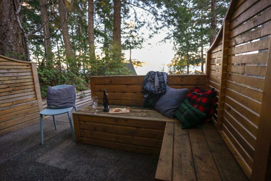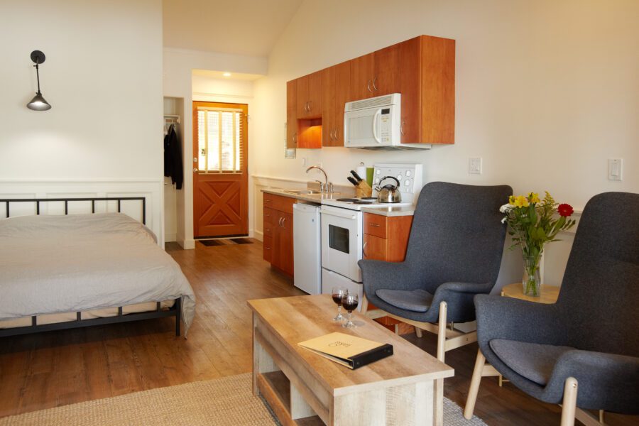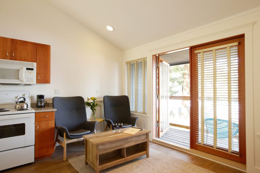 T2: Studio layout with queen bed, kitchenette (bar-size fridge), and bathroom with bathtub. Sitting area with two armchairs. Great as a jumping-off spot for daily adventures. Guests love sitting on the deck watching the view or leaving the French doors ajar to let in the sea air.