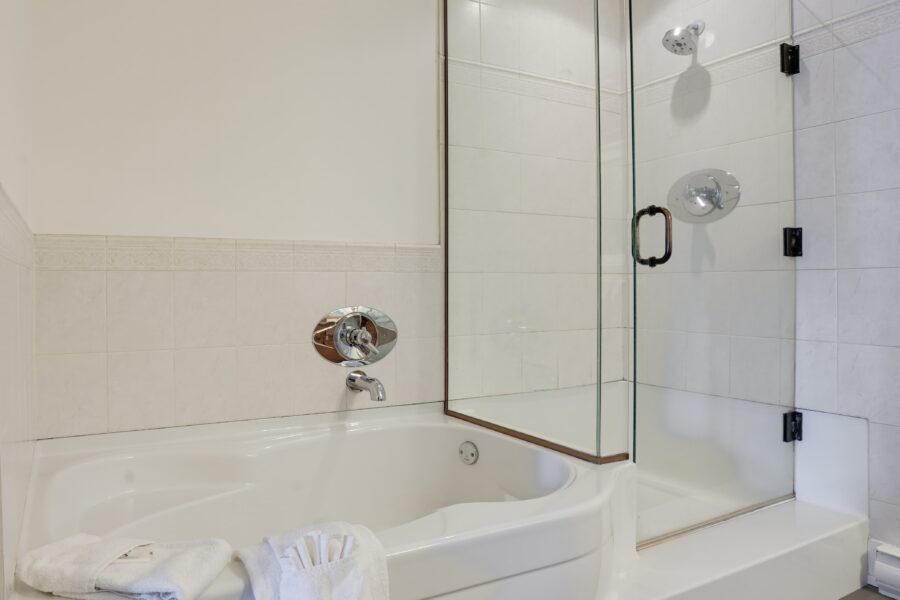 T6: Two queen beds with deluxe ensuite bathroom featuring separate walk-in shower and soaker tub, plus private patio. One-level layout with vaulted ceilings. Very spacious living area for entertaining.