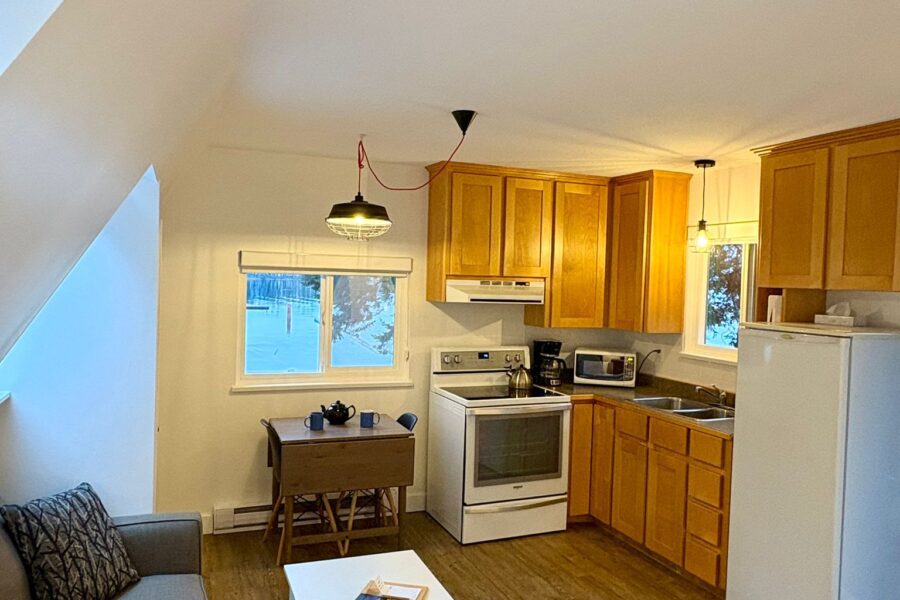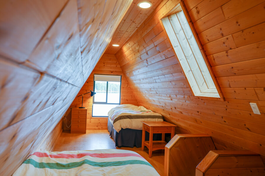 In a fully open concept, the main floors feature gas fireplace, a full kitchen, queen bed and a queen sofa bed. It’s easy to relax and disconnect since these suites don’t have a TV. Up the ladder in the loft, you’ll find three beds. These cabins can sleep up to seven people and are pet friendly.