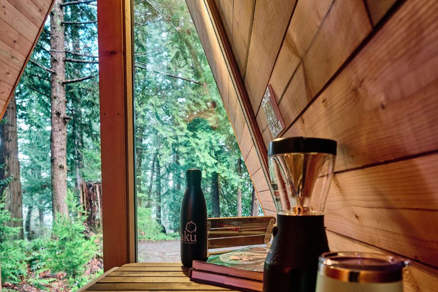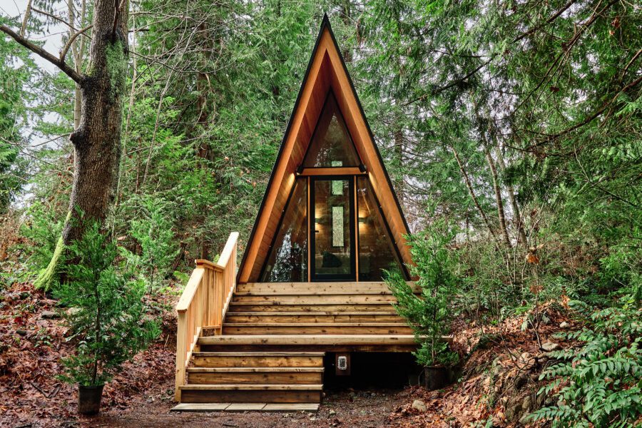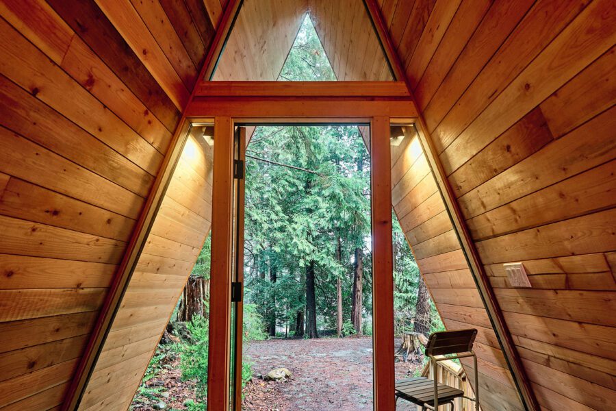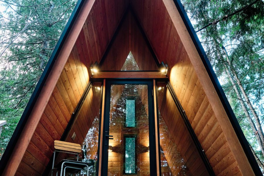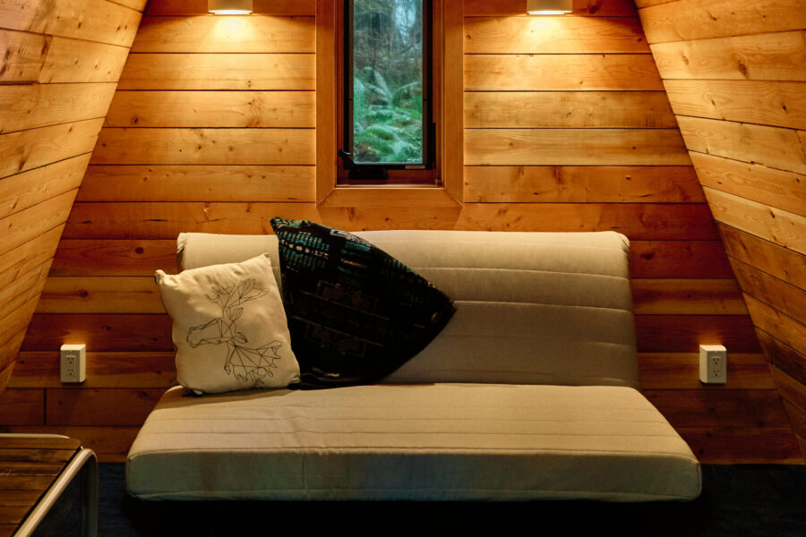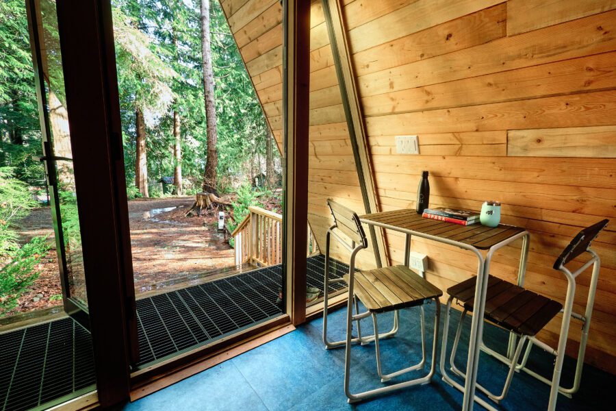 Our new little Bunkie is the perfect a-frame cabin to enjoy the outdoors and enjoy all the resort has to offer. Nestled in the trees, it’s the perfect spot to rest after a day out and about. This is our coziest and simplest accommodation with a double sofa bed and table for two. It’s a step-up from camping. You bring the camping extras like sleeping bags, camping stove and chairs and leave the tent behind. Arrive to a cozy place to sleep and ample outdoor space to set-up your gear. Your four legged best friend is welcome here.